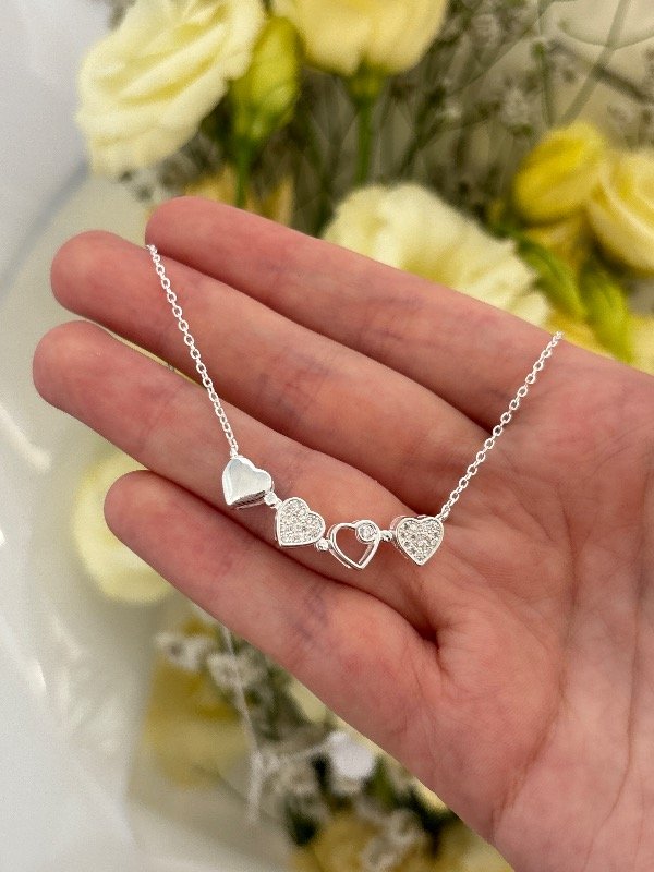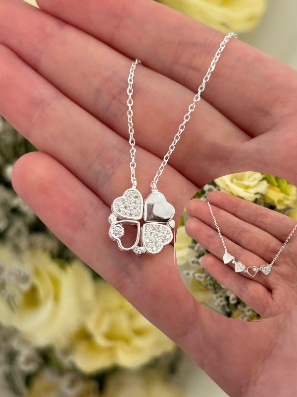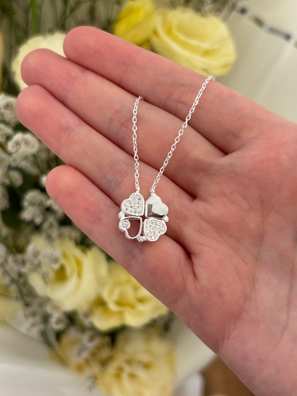 Collar de plata 925, de 40 cm de largo más 3 cm adicionales para ajustar. Incluye un dije compuesto por corazones que se unen mediante un imán y forman un trébol.
