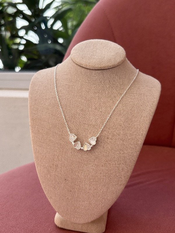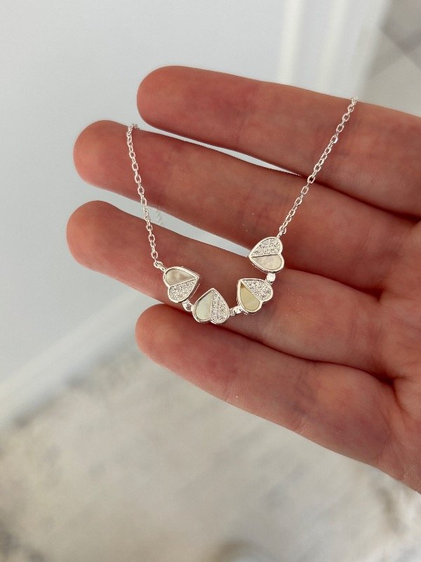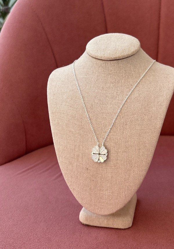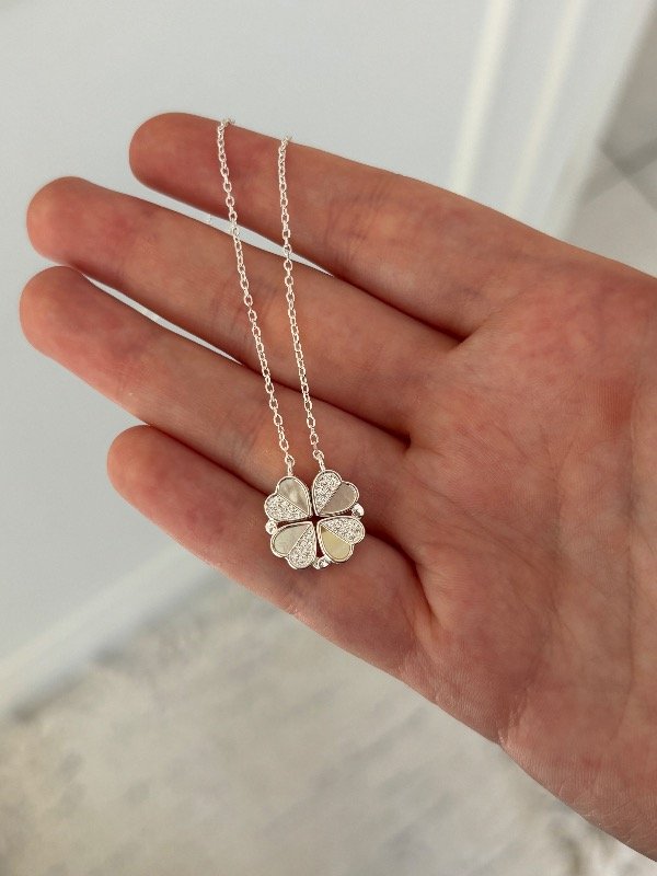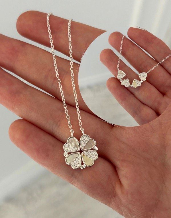 Collar de plata 925 con nácar, de 40 cm de largo más 3 cm adicionales para ajustar. Incluye un dije compuesto por corazones que se unen mediante un imán y forman un trébol.