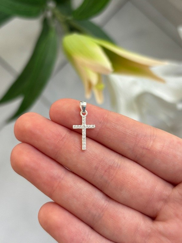 Dije de plata de 2 cm de alto (incluyendo pasador) y de 0,9 cm de ancho.