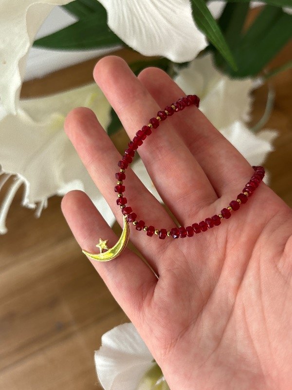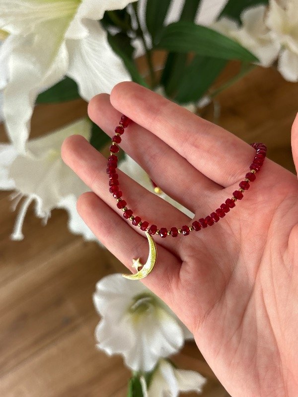 Conjunto en acero dorado con vidrio faceta y dije en enchapado en oro de 40 cm de largo.