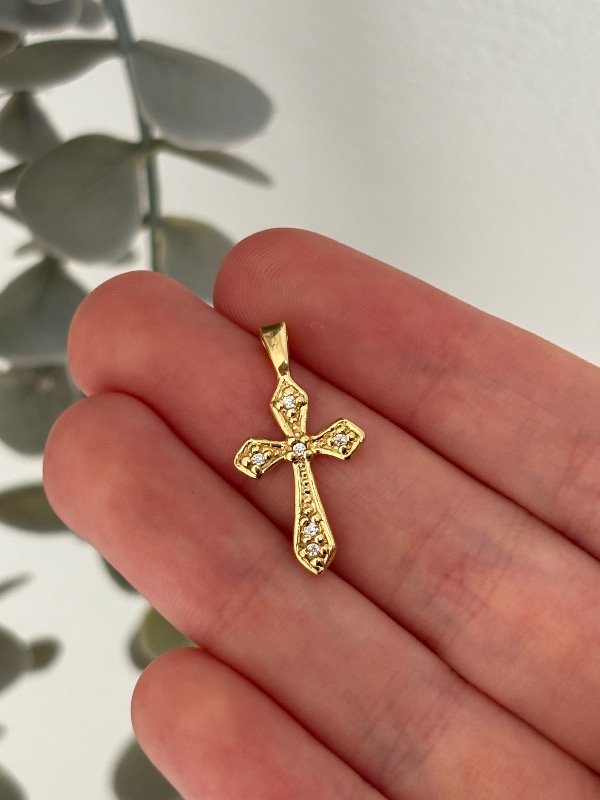 Dije enchapado en oro de 2 cm de alto (incluyendo pasador) y 1,2 cm de ancho.