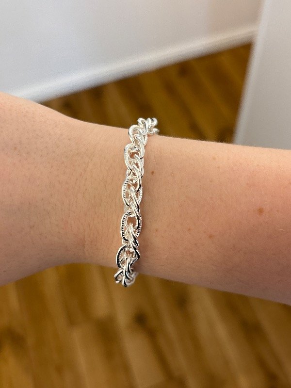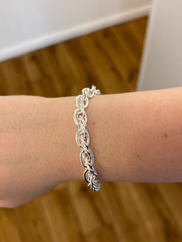Pulsera en acero blanco de 17,5 cm de largo, más 3 cm para regular.