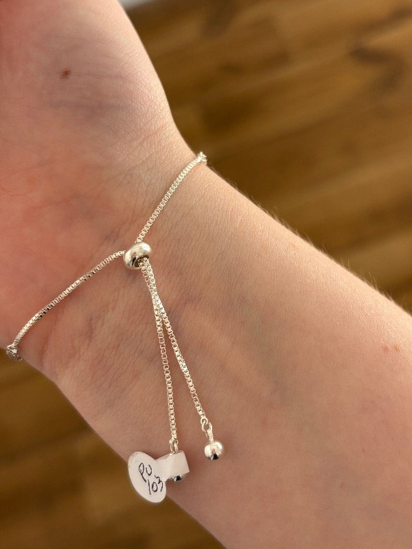 Pulsera en acero blanco regulable de 24 cm de largo.