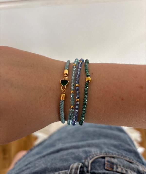 Pulsera enchapada en oro con dije corazon verde de vidrio.